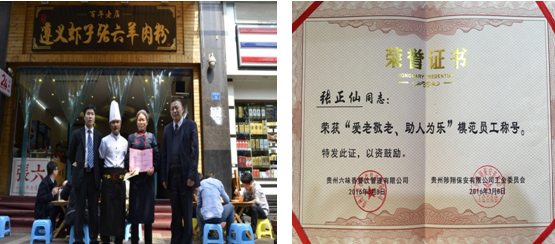 2016年3月6日晚,遵義蝦子張六羊肉粉普陀路店出現(xiàn)了溫馨的一幕:粉店員工張正仙與一位吃粉的老人并不認(rèn)識,當(dāng)時老人與一名老阿姨一起來到粉店,進(jìn)來時張大姐就注意到老人走路不太方便。粉端上桌后,與老人一起來的老阿姨就離開了,老人用右手顫顫巍巍地夾起粉朝嘴里送,很是費(fèi)勁,張大姐看著有點(diǎn)不忍,就走上前去問老人是否需要幫忙。在征得老人同意后,她像照顧自家的老人一樣,站在老人面前,左手端著羊肉粉,耐心地喂老人,擔(dān)心熱湯熱粉燙到老人,張大姐一邊吹冷一邊喂,慢慢的將粉喂完后,才繼續(xù)忙自己的工作。