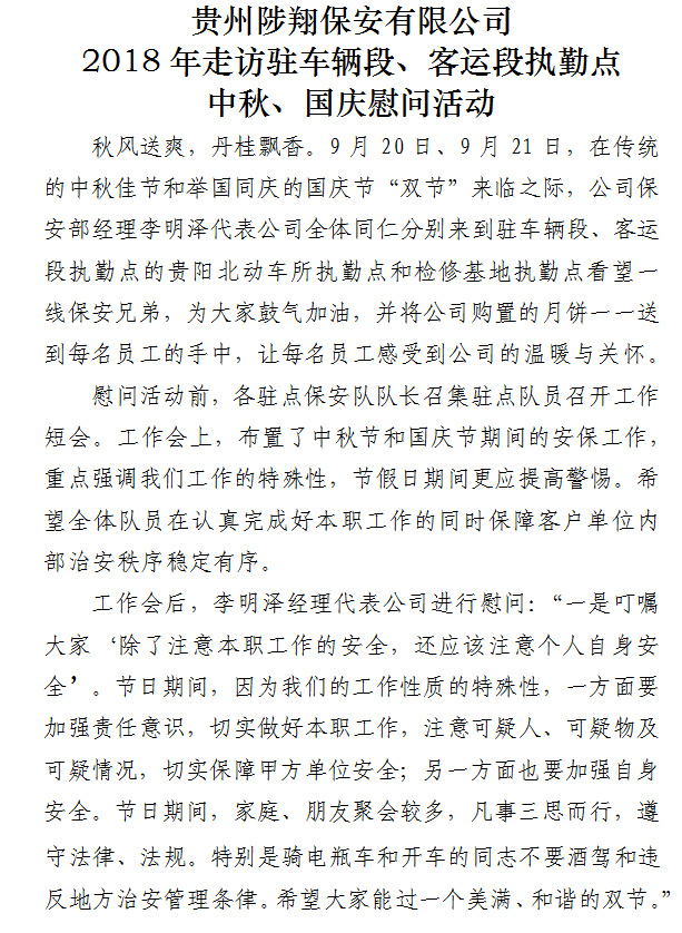 貴州陟翔保安有限公司 2018年走訪駐車輛段、客運(yùn)段執(zhí)勤點(diǎn) 中秋、國(guó)慶慰問活動(dòng)