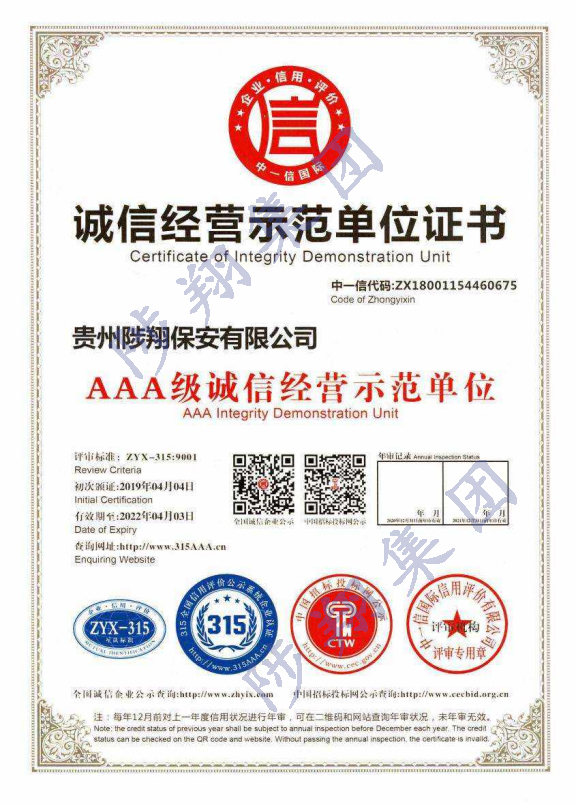 誠(chéng)信經(jīng)營(yíng)示范單位證書(shū)