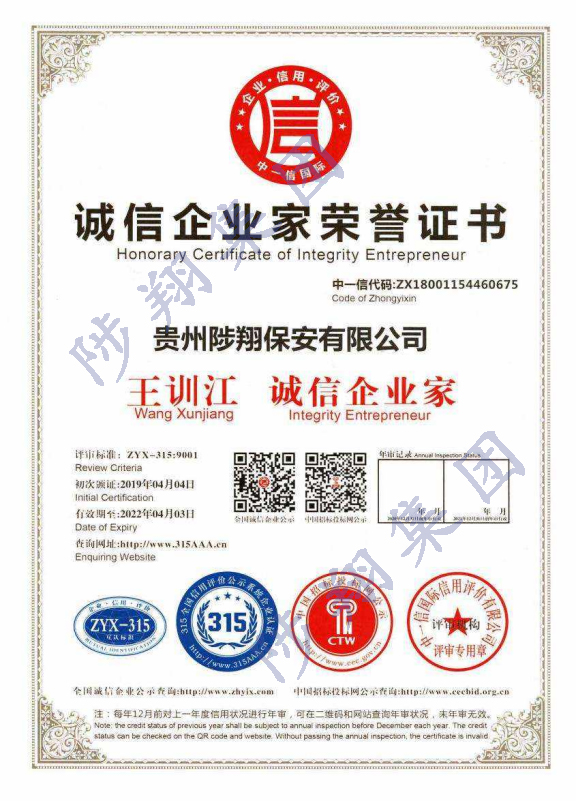 誠(chéng)信企業(yè)家榮譽(yù)證書(shū)